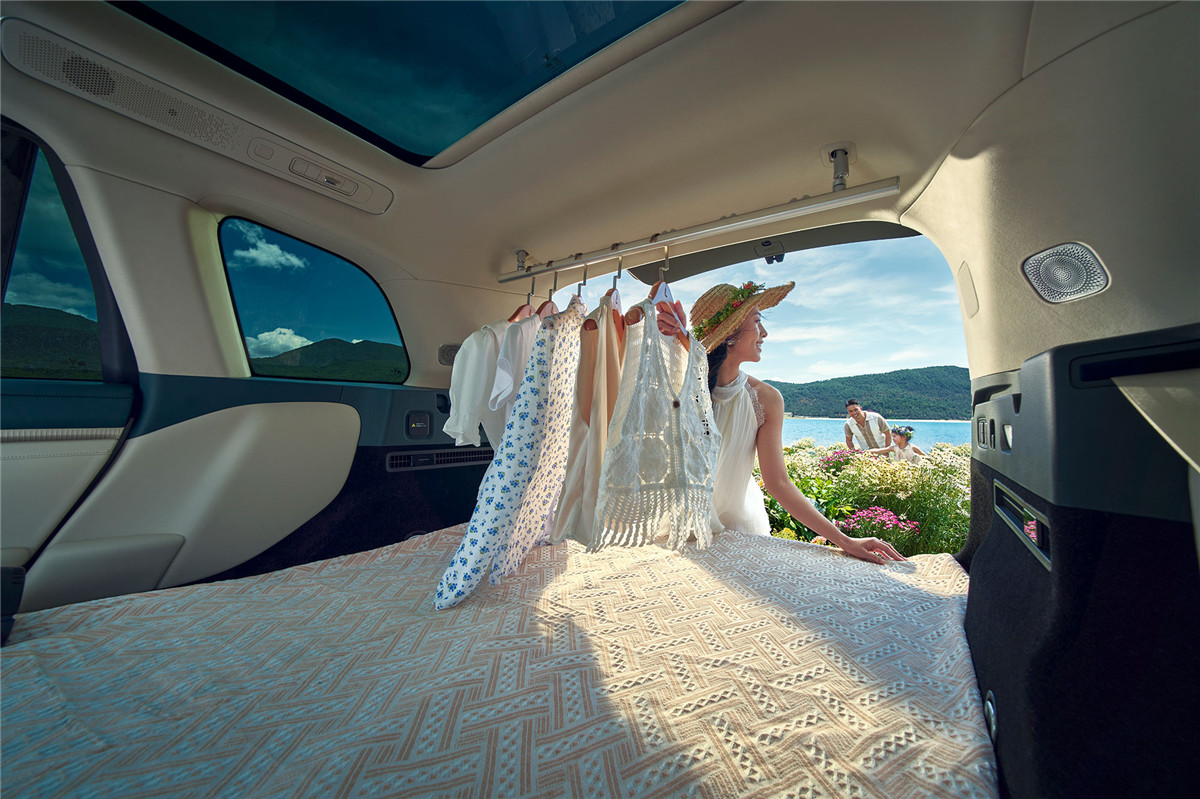 其次是一键成床功能,这是针对露营、午休场景的实用设计。通过语音或按键操作,二排座椅自动下沉、靠背折叠,与后备厢形成纯平空间,配套床垫自动充气,约1分钟就能形成一张2.1米的大床。城市里可作为午休空间,户外露营时直接变身观景床,不用额外搭建,对喜欢短途出游的家庭很友好。