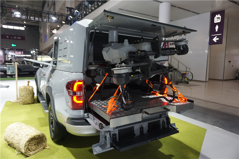 这款车型是国内首款针对无人机集合“运载、 大功率充电、 车机操控”为一体的新能源皮卡车。其车机一体化控制,具备适配产品品类多、功能升级迭代快、用户互动和粘性强的特点,无人机安装、操控平台全电动化,操控使用简单便捷。