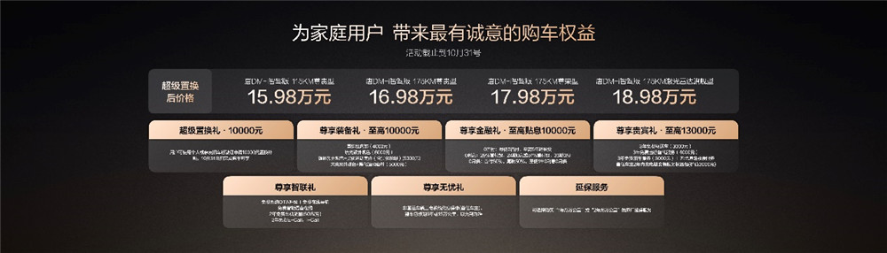此次,唐DM-i智驾版175KM长续航版共推出3款车型,售价17.98万~19.98万元(10月31日前完成购车可享10000元置换补贴)。同时,比亚迪还为用户准备了包含置换补贴在内的至高价值4.3万元盛唐礼遇。