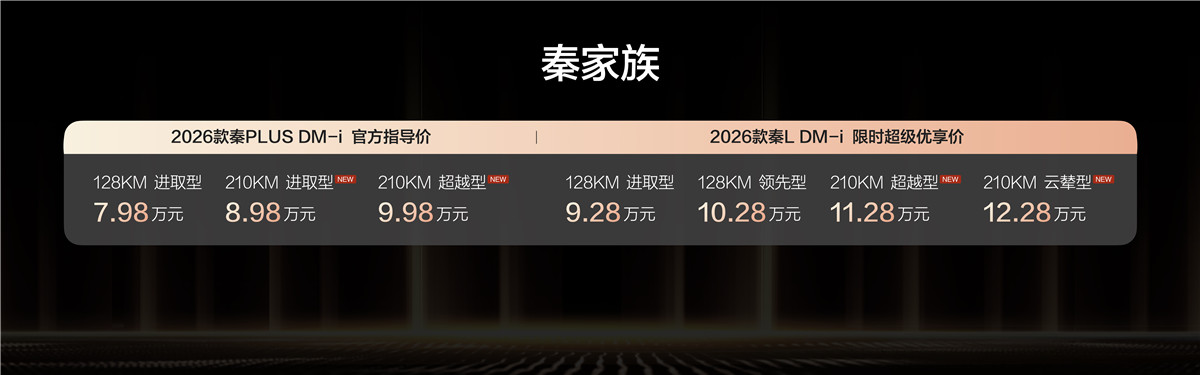 2026年1月8日,比亚迪秦家族迎来重磅升级,2026款秦L DM-i与2026款秦PLUS DM-i同步推出210KM长续航版本,官方指导价8.98-12.28万元。这不仅标志着插电混动轿车纯电续航正式迈入"200km+"时代,更以"中杯价格、超大杯体验"的产品策略,对8-12万元级家轿市场形成了颠覆性冲击。