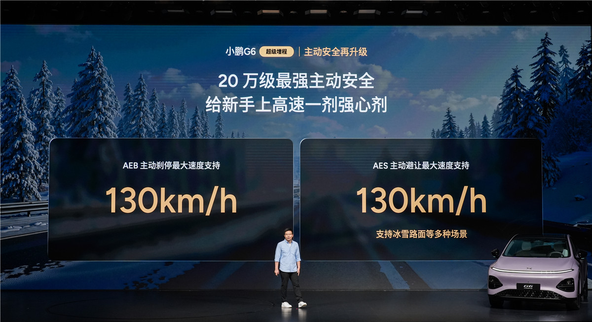 在主动安全方面,新车配备了15项功能,堪称同级最强。2025年,小鹏的主动安全系统已成功避免了超过9万次潜在事故。其中,AEB自动紧急制动和AES主动避让功能均支持最高130km/h的工作时速,能有效应对冰雪路面等复杂场景。针对高速行驶中最危险的爆胎情况,新车还搭载了同级首个支持180km/h的高速爆胎稳行功能,能在突发状况下最大限度保持车身稳定,守护驾乘安全。
