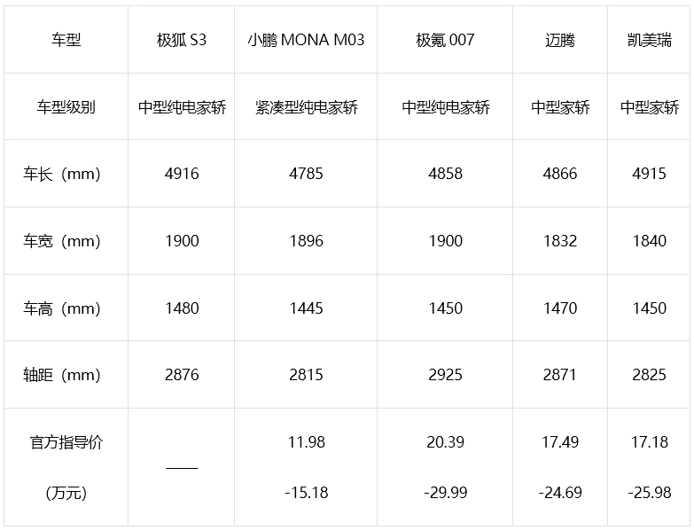 要知道,这个尺寸不仅比市面上多数热销的10万级纯电家轿大一圈,甚至超越了凯美瑞、迈腾等经典燃油B级车。这意味着,以前要花二十万才能拥有的中型车空间,现在极狐S3用10万级就给你了。即便把它和不少热门中大型轿车放在一起,尺寸也基本相当。