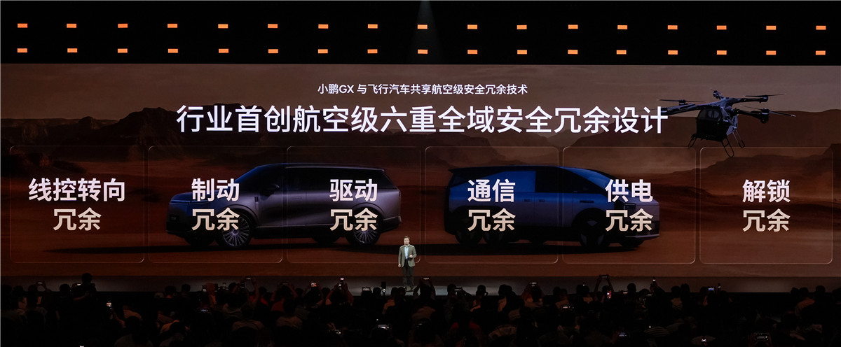 冗余安全则是小鹏GX对标航空级标准的“双保险”。线控转向、制动、驱动、通信、供电、解锁六大核心系统,全部做了多重备份。比如线控转向有四重备份,哪怕三个系统同时失效,车辆仍能靠剩下的一个系统安全靠边;制动系统也有四重冗余,就算制动踏板断了、管路漏了,备用系统也能稳稳把车停下。“就像飞机有两个发动机,一个坏了另一个还能飞,”何小鹏打了个比方,“车的安全,容不得半点侥幸。”