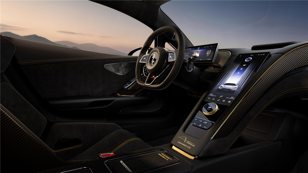 外观最直观的特色是专属漆面,车漆中加入微米级超细金粉,经过多层清漆固化处理,在不同光线下能呈现出阳光穿透云层的流光效果,视觉质感细腻且独特。哑光金部件还采用中国非遗大漆的打磨工艺,让车身兼具现代超跑的凌厉与东方工艺的温润,不是简单的元素叠加,而是把传统技艺融入现代造车流程。