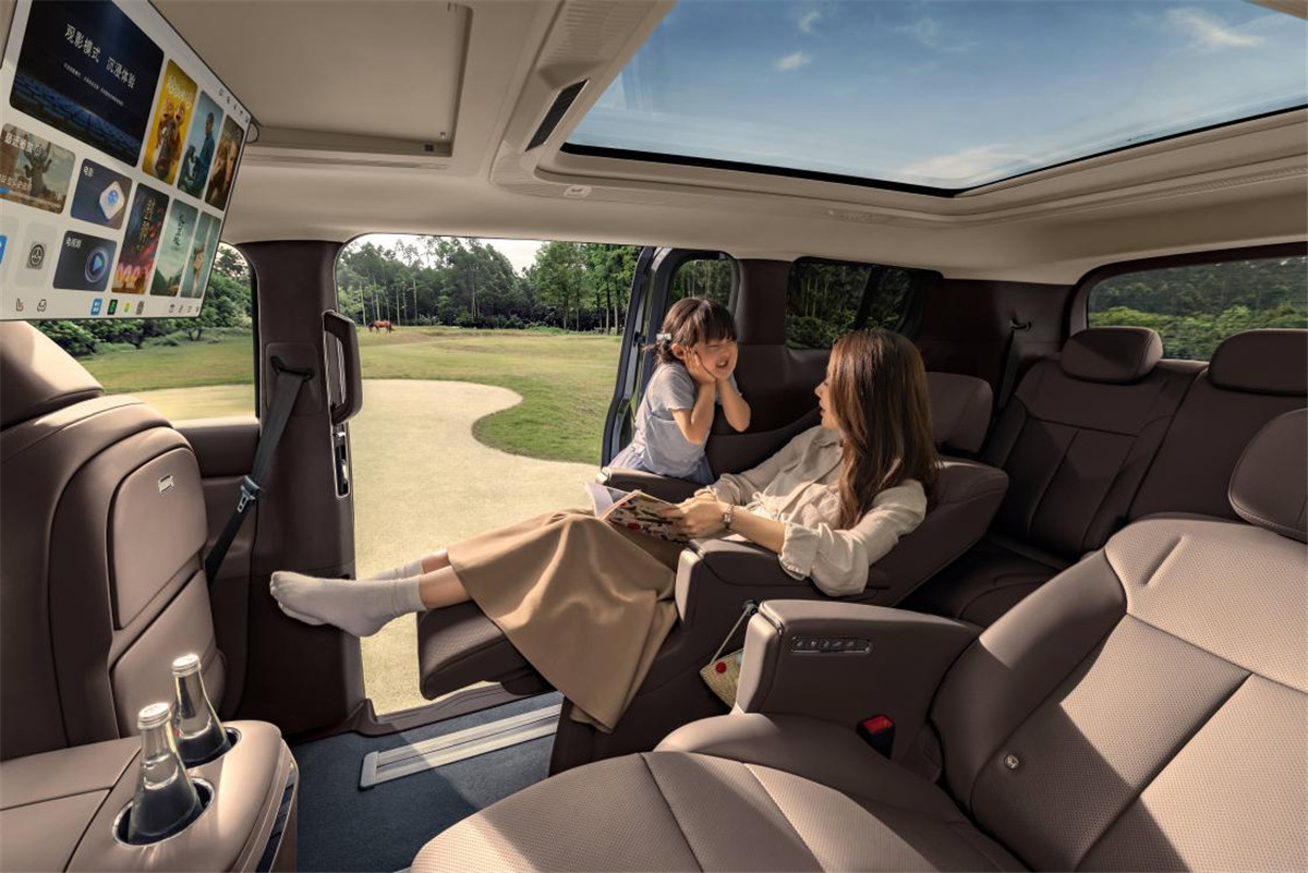 座舱静谧性是一大亮点,联手国家大剧院做声学调校,全车24处声学隔断、5mm双层隔音玻璃、高密度发泡隔音地毯,高速120km/h行驶时车内噪音控制在52分贝左右,接近图书馆级别。音响系统最高配到22个扬声器,带头枕音响与天空声道,配合21.4英寸二排折叠屏和氛围灯,长途坐车可以有不错的影音体验。