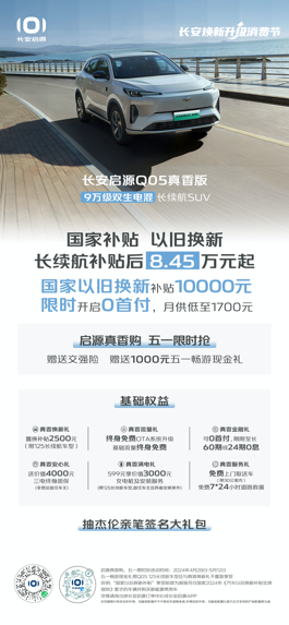 超高品质,超值礼遇。长安焕新升级消费节,启源真香好礼等你来拿,五一假期来启源,把爱车带回家。