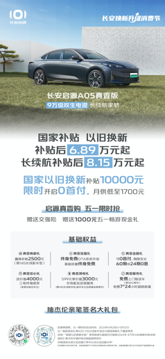 五一小长假到来之际,国家发布以旧换新新政策,为更好的回馈广大用户,长安启源积极响应国家号召,补贴加码,限时享至高30000元以旧换新补贴,再享“五一限时权益”:限时赠送交强险,价值1000元五一畅游现金礼,还有周杰伦亲笔签名大礼包等你抽;