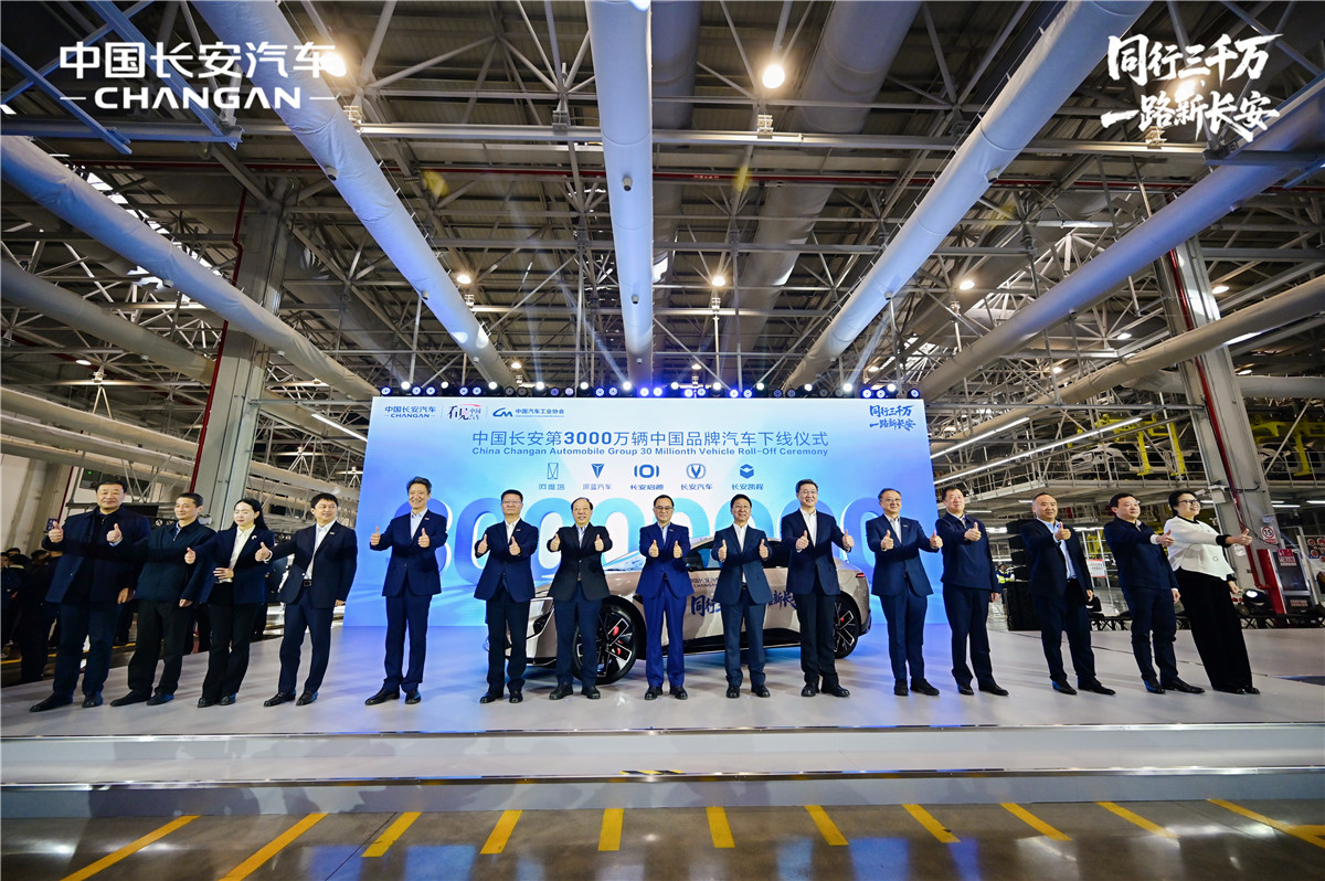 3000万辆,是辉煌的勋章,更是奔赴未来的起点。在下线仪式上,中国长安汽车党委书记、董事长朱华荣表示:“立足3000万新起点,我们将坚定向智能低碳出行科技公司转型,力争到2030年实现整车产销500万辆,其中新能源占比超60%,海外占比超30%。”